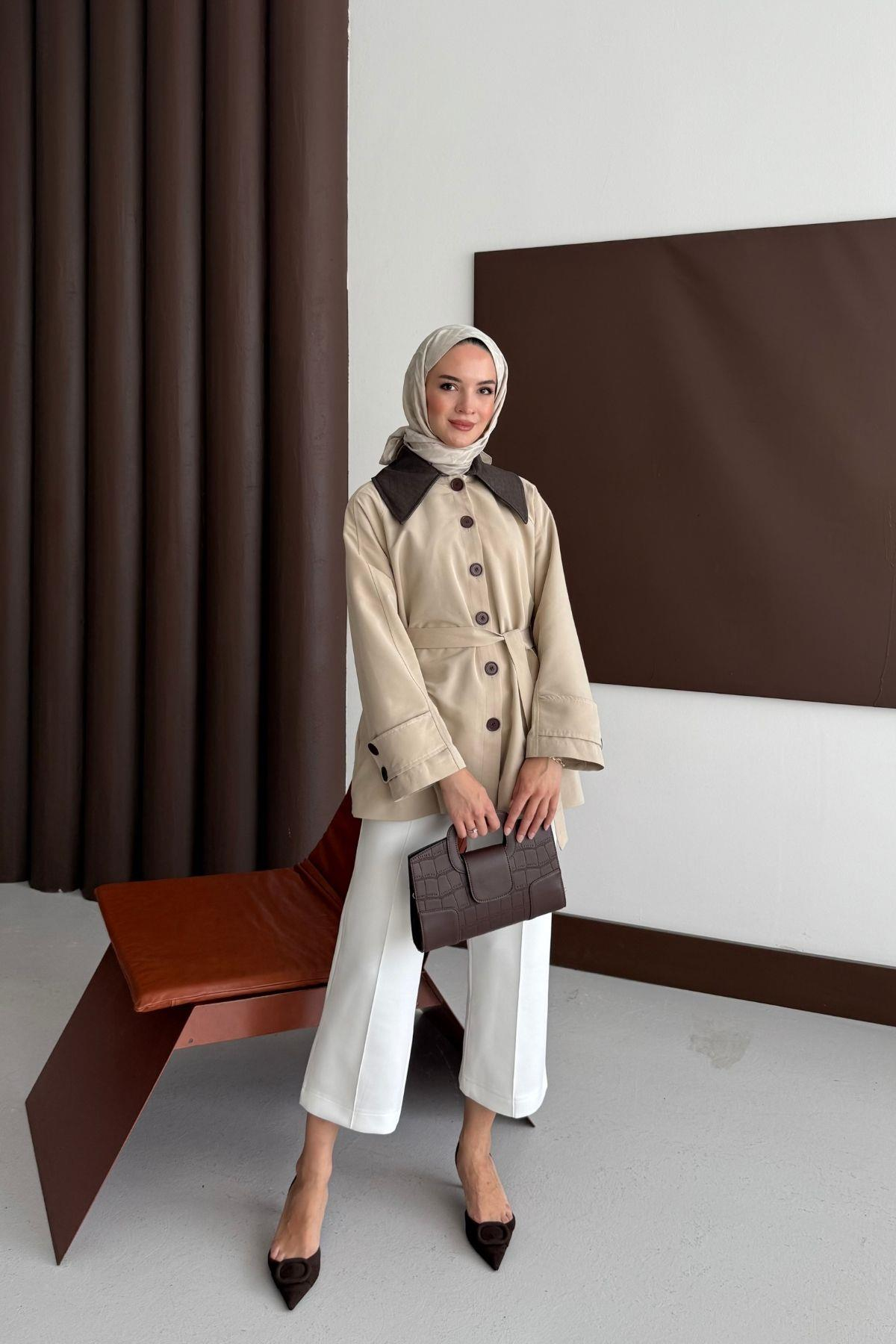 Deri Yakalı Tasarım Trençkot Bej