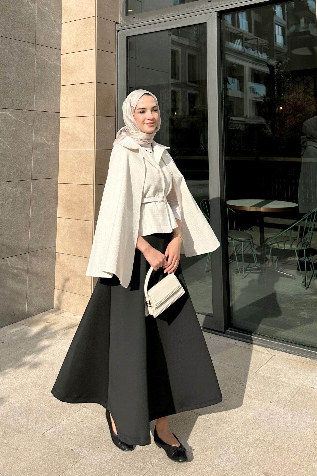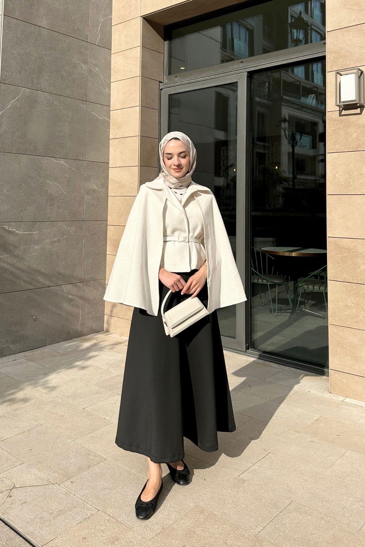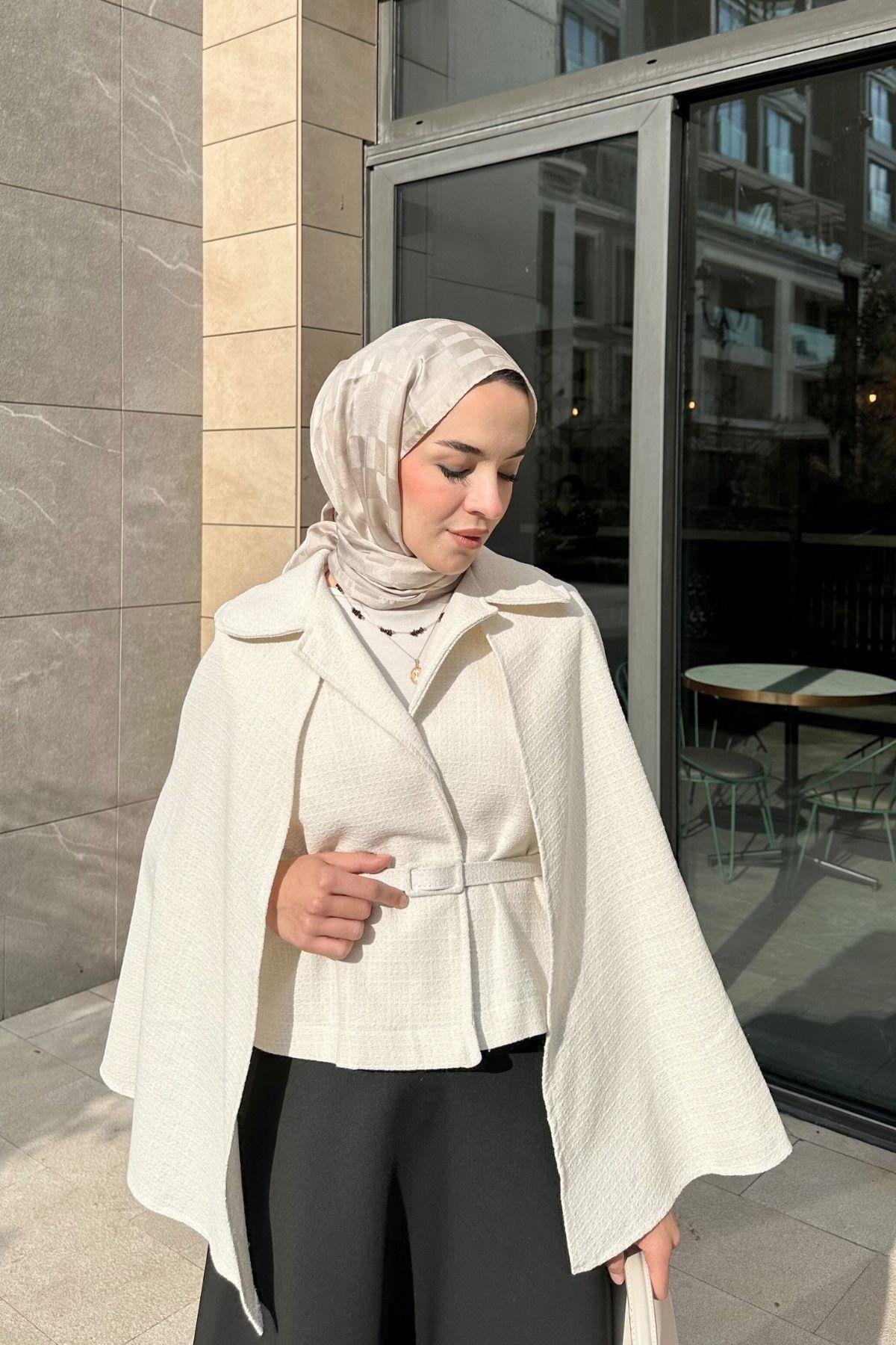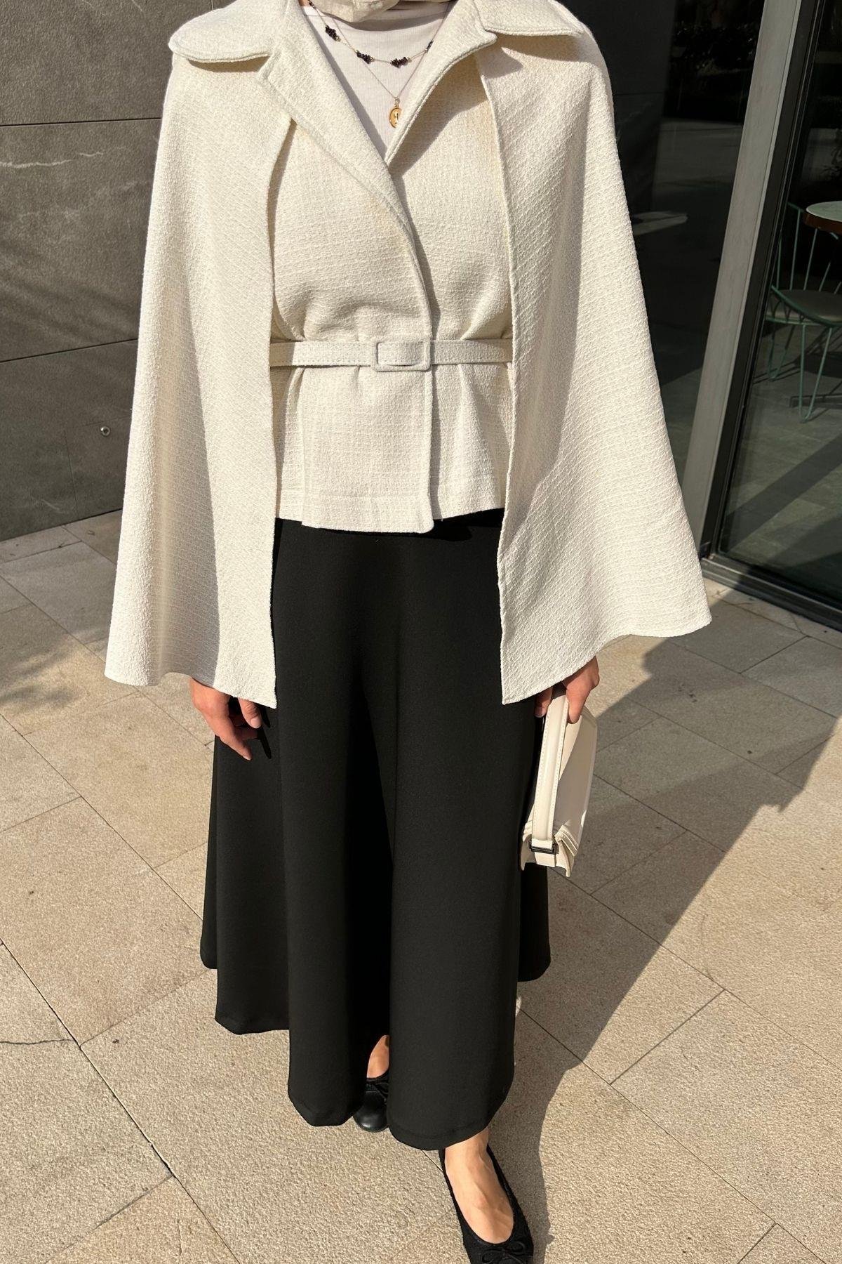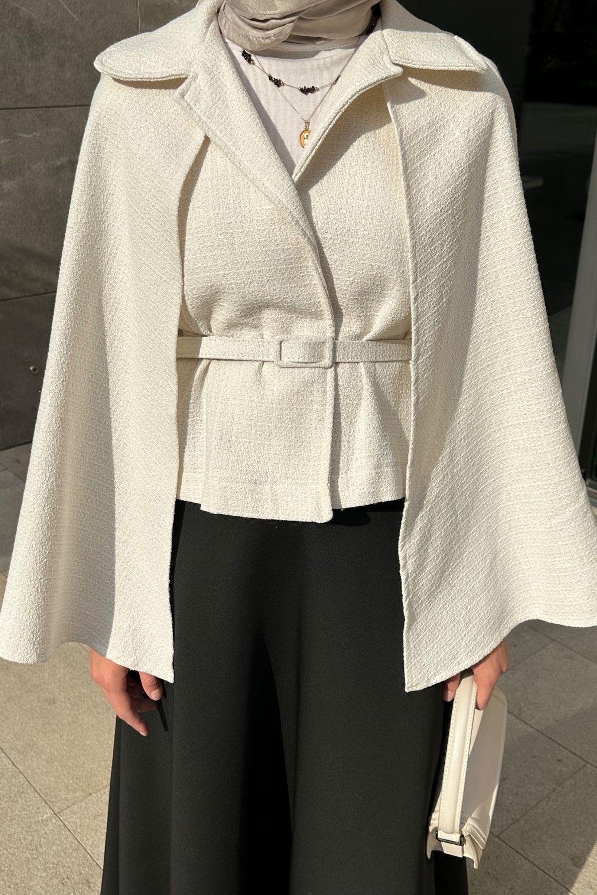 Pelerinli Tüvit Ceket Ekru